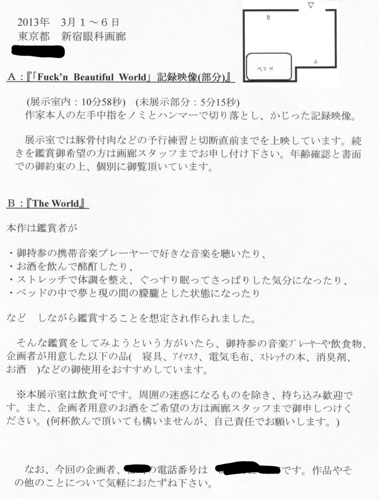 作家自身の、連想の記述を記録した映像を、記述後の用紙に投射し、幾つかの日用品を使って、それを変則的に鑑賞することを促した。