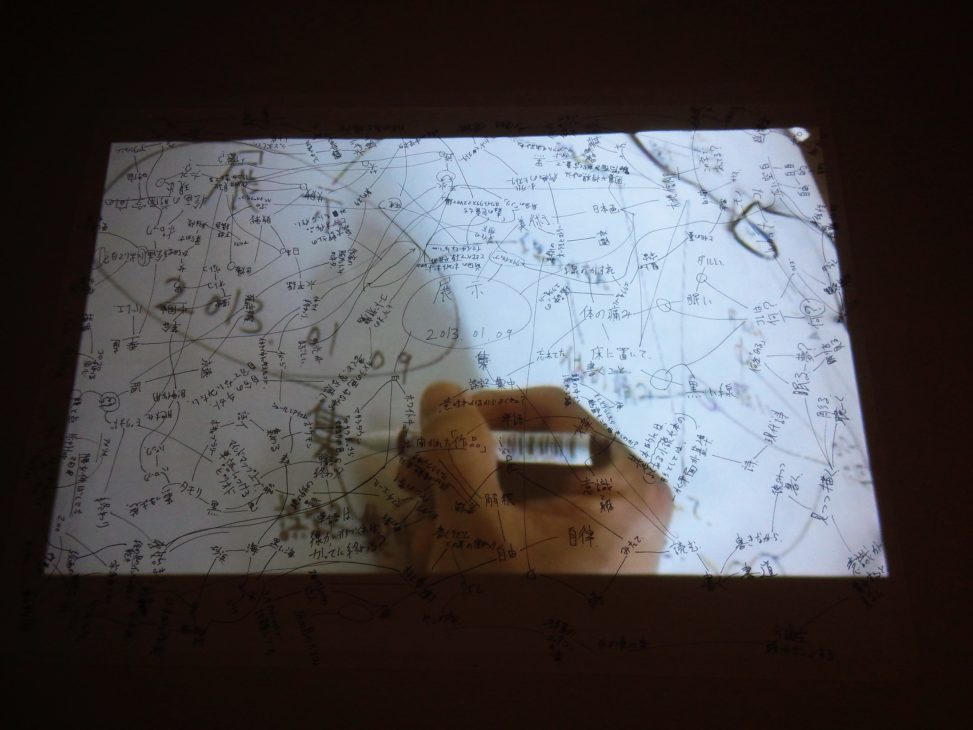 作家自身の、連想の記述を記録した映像を、記述後の用紙に投射し、幾つかの日用品を使って、それを変則的に鑑賞することを促した。